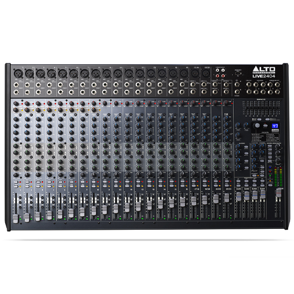 The Alto Professional Live 2404 is a pro 24-channel, 4-bus mixer equipped with the tools you need to create the perfect mix. With flexible routing options and a multitude of onboard DSP tools, Live 2404 fits the demands of nearly any live performance environment. It features 18 balanced XLR inputs with switchable phantom power, 3-band EQs with sweepable mids for additional tonal shaping, four aux sends per-channel for external effects and monitoring, and a 9-band graphic EQ for main or monitor outputs. A headphone jack with an independent level control enables additional monitoring and mixing. 60mm faders with LED meters provide precise control and visual feedback for accurate, hands-on mixing. With its diverse connectivity options, Live 2404 can handle any sized event from small coffee house gigs to mid-sized ensembles to full-stage rock bands.