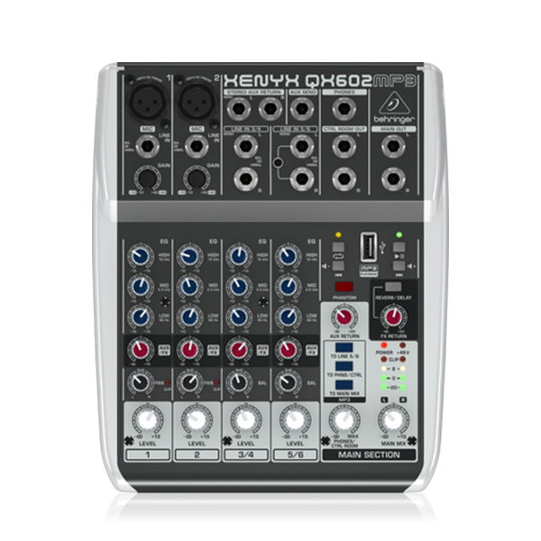 The ultra-compact XENYX QX602MP3 2-bus mixer delivers professional sound and surprising versatility in a portable format. With 6 inputs, including 2 studio-grade XENYX mic preamps with phantom power, ultra-musical British EQs, and two stereo channels, it provides crystal-clear performance for everything from vocals to instruments. A built-in MP3 player lets you play tracks directly from a USB stick with simple onboard controls, while the 24-bit stereo multi-FX processor adds studio-class reverb and delay for that polished finishing touch.