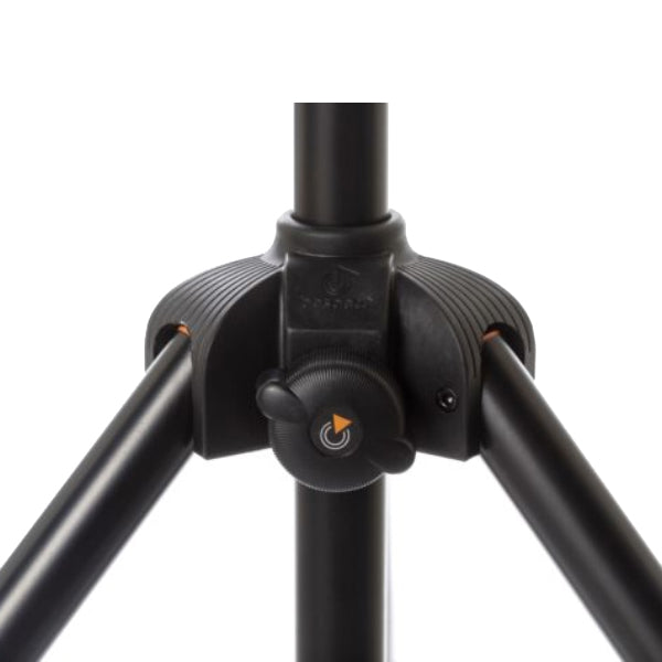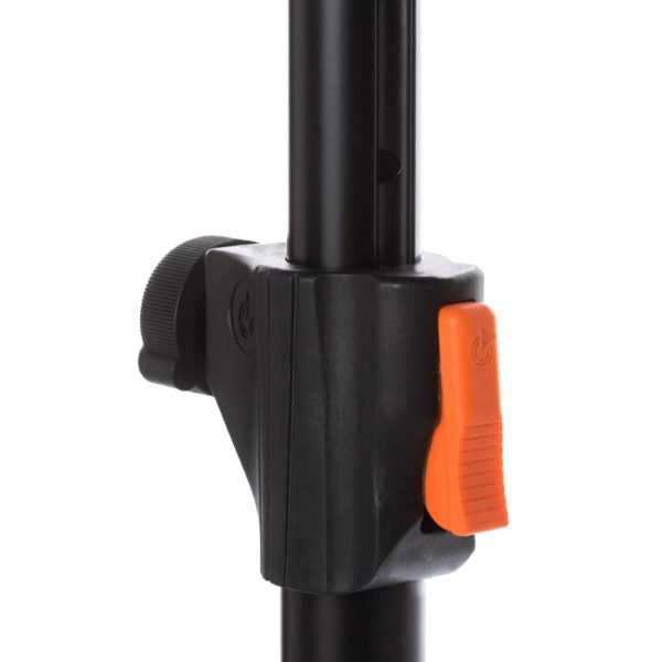 The Bespeco PN90XLNO is a pneumatic air-cushion speaker and light stand, which can safely lift a speaker or light weighing 198.4 lb to a height from 52.6 to 83.9". The single push-button mechanism provides an all-in-one security pin to allow the tube to lift to the desired position, while an ergonomic, rubber covered knob provides the final fixing to the tube's placement. The nylon link base also features an ergonomic, rubber covered knob that allows the three legs to quickly and easily lock into place with minimal effort. The aluminum upper tube is equipped with an anti-rotation guide and equidistant holes for precise and fast regulation.