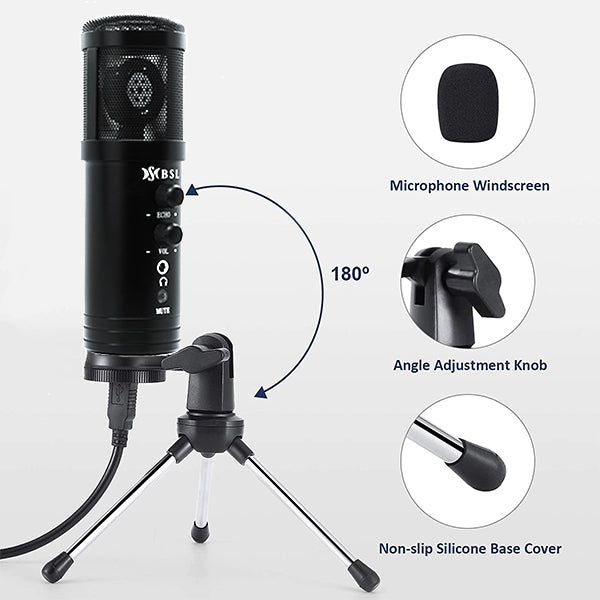 BSL BM-858 come with Echo fucntion. It allow user to adjust the volume and echo effect directly on microphone by turning knobs. You don't have to use professional software to get a better voice, but turning the knobs only. The 3.5 mm headphone jack allows you to hear your voice more clearly. Another great feature is that the microphone supports Touch-Key Mute.Moreover, the microphone is designed to plug & play. You don't have to install any software or complex settings. Just connect to your Mac or Windows computers and start your first podcast. There's professional sound chipset preset inside. With the soundproof cotton, your voice will appear to be as actual and clear as your real voice. It has cut off most unnecessary noise and returned the most actual sound for you. The Package come with stand is made of durable steel. It's easy to adjust every angle and height to match your working position. Also it can keep extremely stable. Just say no to shaking microphones.