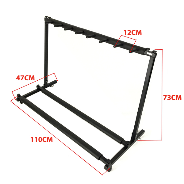 Keeps your guitars and basses readily at hand easily and conveniently. The Multi-Instrument Floor Stand Guitar Holder Display Rack can hold all types of guitars including electric, classical acoustic, and bass guitars. This high capacity multi Guitar Stand can hold up 3 to 7 multiple guitars and guitar bag / cases all at the same time without tripping over.Foam padded support to protect guitar. Safe for standard polyeurethane finishes, not recommended for vintage/lacquer finishes