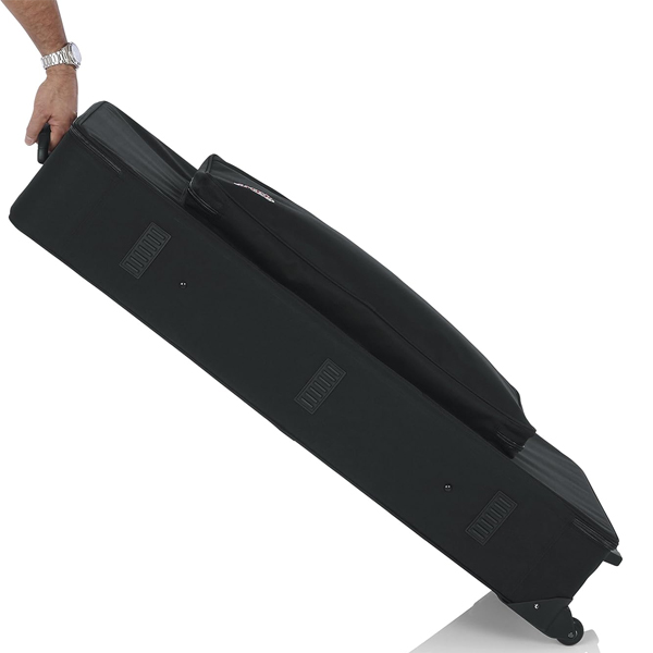 The 600-Denier nylon exterior of the GK-61 is strong, rugged, and tear-resistent, protecting your gear from bumps and moisture. The sturdy semi-rigid frame that gives this case it's power is covered with a soft foam and interior tricot lining for powerful protection with a velvet touch. Fully adjustable padded straps help ensure a secure fit for your keyboard and keep it from shifting during transit. But what good is protection without portability? Gator's solution is to give you wheels and a sturdy tow handle so getting from the car to the stage is easier on your back than ever. The rubber skid bars and feet help keep the case from slipping around and offer added impact protection for your precious rig. Outside, you'll also find large, zippered pockets - the see-through mesh pocket is perfect for cables while the larger compartment has smaller organization pockets and is perfect for business cards, small tools, and pedals. The zippers are heavy-duty for years of use and offer full access to the case, so getting your keyboard in and out of the GK-61 is super-easy, making your load ins and tear downs quick and painless.
