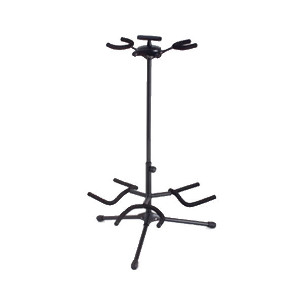 Holds three guitars securely. Stable when less than three guitars are stored. Welded extension tubes for cradles and all removable components are keyed for easy and secure assembly. Die cast hub for long life. Convenient handle for moving included on top. Satin rubber cushions for protection. Folds for transport and storage. Durable black powder coated finish.