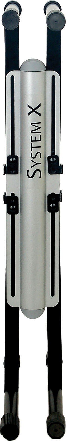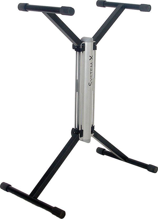 The System X KB7700K Keyboard Stand offers the portability and simplicity of the time tested 'X' braced keyboard stand without the limited usefulness inherent in 'X' stands at the limits of their height ranges. Traditional 'X' braced stands get too wide to accept smaller keyboards at low (seated) position settings and too narrow and unstable at the taller (standing) positions. The System X Keyboard Stand maintains the same stable arm and leg width under the keyboard throughout its entire height range.