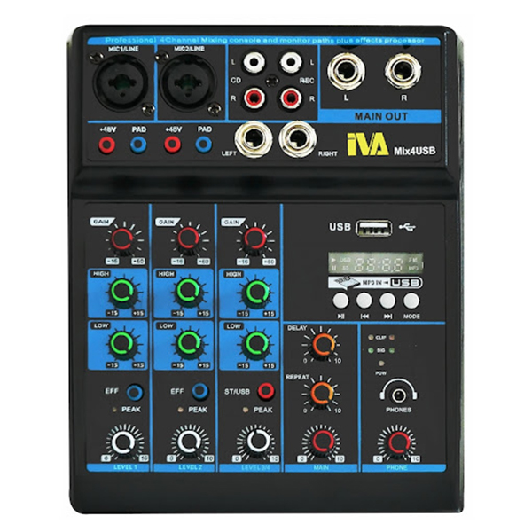 IVA Mix4USB will be the most affordable USB Audio Interface based mini analog mixer for your home studio, live streaming need and your work-at-home conference meeting. It give your good audio for your recording at 48 kHz sampling rate. Mix4USB is equipped with USB module to give you flexibility to play MP3 songs from thumbdrive and a Bluetooth connectivity for those who prefer wireless option for the music playback. The 2-band EQ allow you to tweak the tonal of the sound while the effects (FX) turn Mix4USB into a karaoke mixer beast.