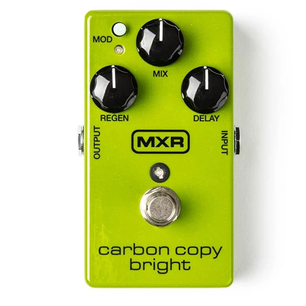 MXR's Carbon Copy Bright analog delay pedal is designed for players looking for a more present and articulate delay tone. The core of the Bright shares the same 100% analog Bucket Brigade circuitry as the popular first-generation MXR Carbon Copy, but the Bright is tuned for more clarity. Its voice lends itself well to delay stacking, giving you a decidedly three-dimensional sound when used with the darker-sounding original. The MXR Carbon Copy Bright delay pedal has all the analog goodness you want with a slightly brighter tone.