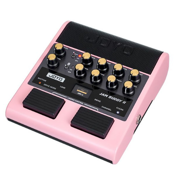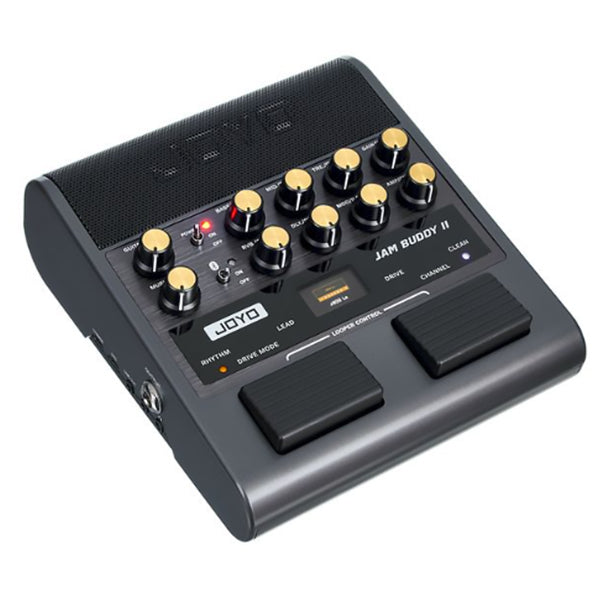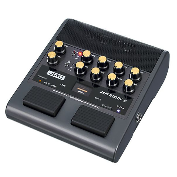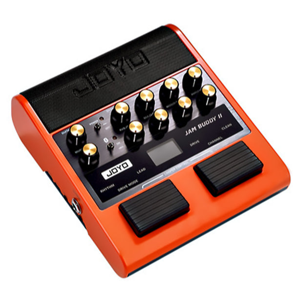 The JOYO Jam Buddy II is a portable, floor-based "all-in-one" guitar practice station that integrates a digital modeling amplifier, multi-effects processor, and Bluetooth speaker into a compact, rechargeable unit. Designed to function as a complete standalone rig, it features 14 high-quality amp models and nine built-in effects, including modulation, delay, and reverb. Unlike traditional desktop mini-amps, its pedal-style chassis and dual footswitches allow guitarists to switch between Clean, Rhythm, and Lead channels hands-free, making it an ideal tool for home practice, travel, or quick song sketching.
