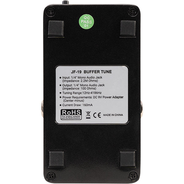 JF-19 Features Buffer and Tuner. The Buffer save the trouble of long audio cables or tone loss due to multiple pedals are connected in series, while the Buffer circuit retains the original tone when multiple pedals are in use. Fits for 7-string guitars and basses thanks to its super fast reaction and highly accurate tuning algorithm, tuning accuracy:+/-1 cent, real-time LED display enables you to read it clearly on dark stages. DC 9V Output Jack (Center Minus). Besides, you can choose between True Bypass mode and True Buffer mode by the selector switch.