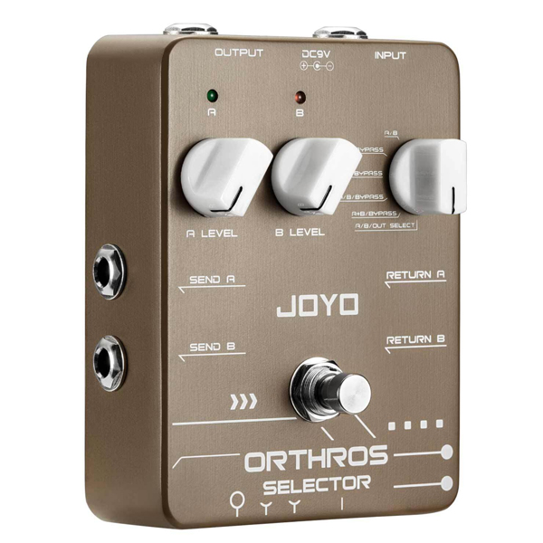 The Orthros is an advanced multi-mode utility pedal from the folks at Joyo, featuring myriad line selection and switching options. Pick from A/B, A/Bypass, B/Bypass, A/B/Bypass, A+B/Bypass, A/B/Out Select while using the A/B send and return. Independent level switches on both A and B allow for volume control when switching between pedals, amps, or even guitars. It offers 2 Effects Loop and 6 Looping modes.