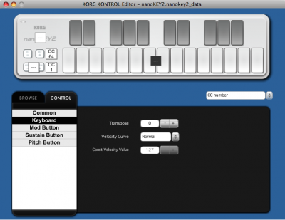 The nanoKEY2 works with the "Korg Kontrol Editor" software – available for free download on the Korg website. Load it into your computer, and use it to make detailed customized settings. Choose from a total of four velocity settings: three velocity curves or fixed velocity; specify the control change messages transmitted by the modulation button and the sustain button.