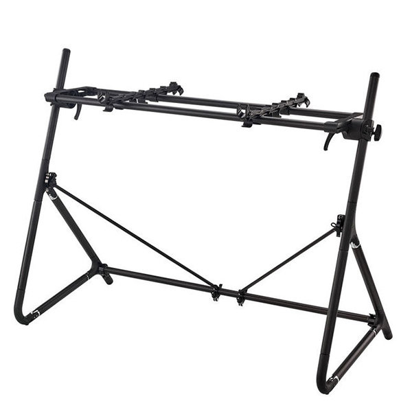 The black Standard-S-ABK Standard Keyboard Stand for 61-Note Keyboards from SEQUENZ is lightweight and durable to support your keyboard setup. When disassembled, it becomes compact and portable. This stands height, angle, depth, and the number of level tiers (keyboard racks) can be adjusted, letting you create the optimal settings for your equipment set up. The Standard-S-ABK is made of aluminum pipe with a black finish. It is compatible with these keyboards: KORG KRONOS2 61, KROME 61, KingKORG, PA900, KROSS 61, and other products within these dimensions and weight limits