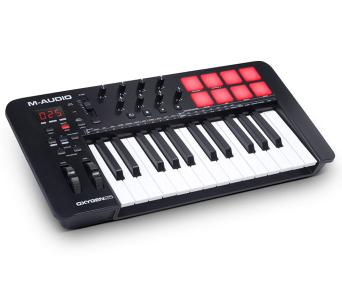 The Oxygen 25 (MKV) controller includes powerful features essential for creating and producing music such as Note Repeat (a staple mark in beat production), Full Velocity Control of keys and 8 pads, 8 assignable knobs for controlling effect plugins and virtual instruments, and an assignable fader for mixing: all opening a world of precise music creation techniques making your signature sound professional and modern.