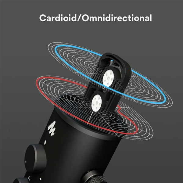 You can select Cardioid or Omnidirectional pickup mode according to your situation, the Cardioid mode is more suitable for podcasting, interview, gaming, Recording, voice-over while the omnidirectional mode is better for scenes that need to record a lot of vocals like a meeting, conference.