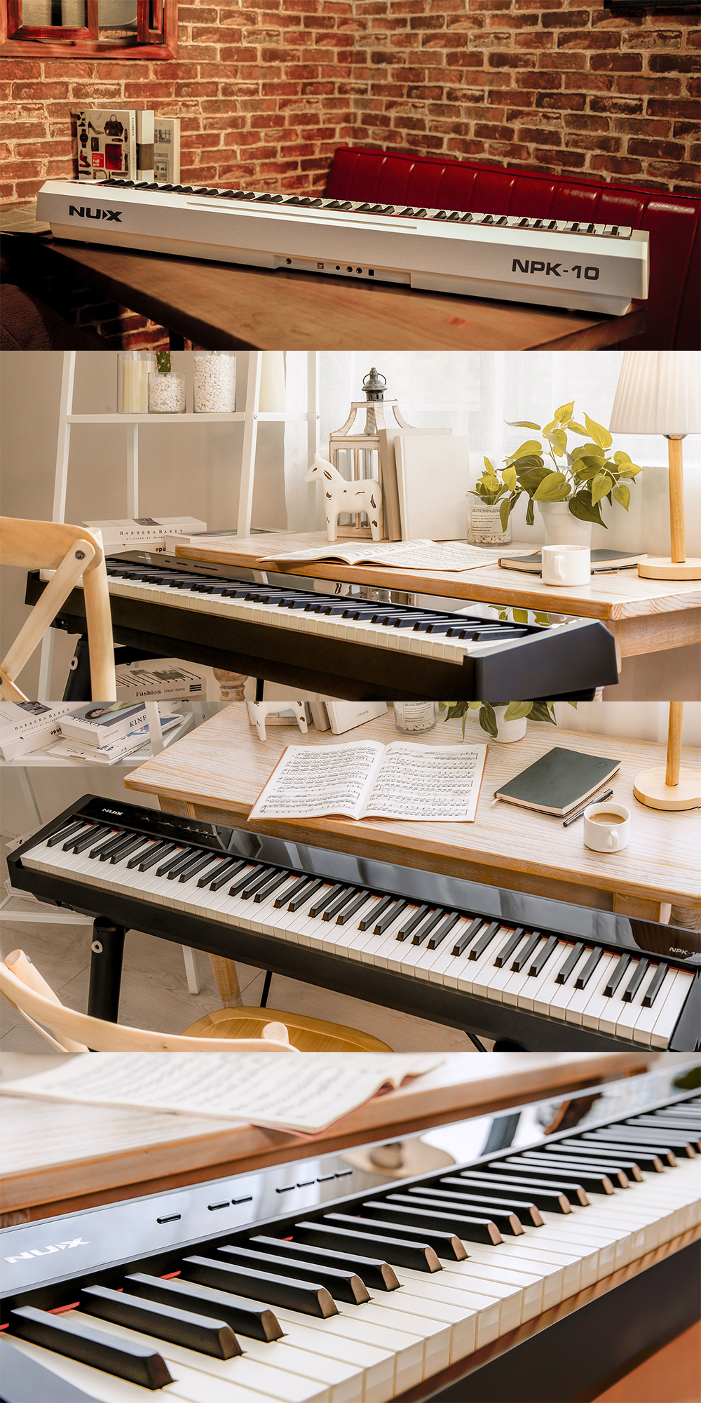 To provide the most authentic piano feel, NUX NPK-10 is equipped with advanced keyboard features - the superior WKJ-03 triple sensors, scaled hammer action, escapement and ivory-feel keys, and 5 types of touch sensitivity to fit different styles. It is rare among similar price-point products, but NPK-10 understands your desire for the finest touch and the most delicate expression