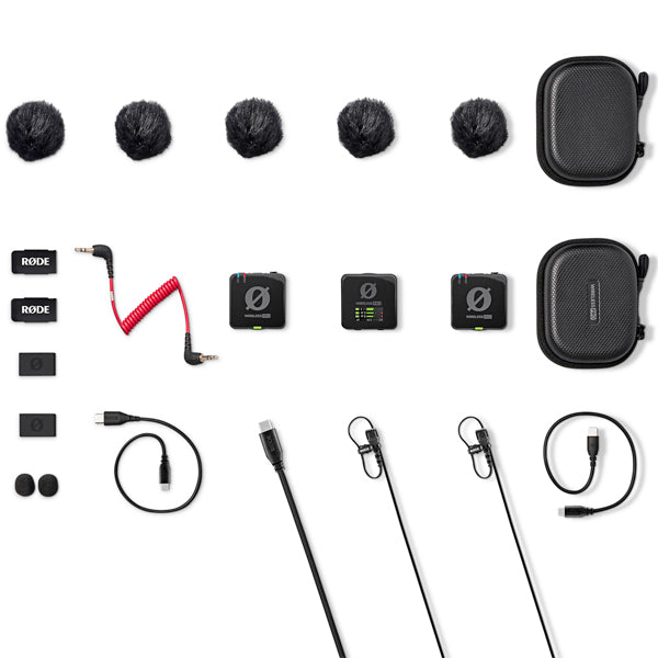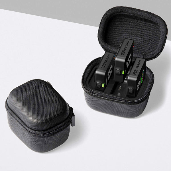 - Complete accessory kit, including smart charging case, two Lavalier II microphones, cables, MagClip GO magnetic mounting clips and accessory case