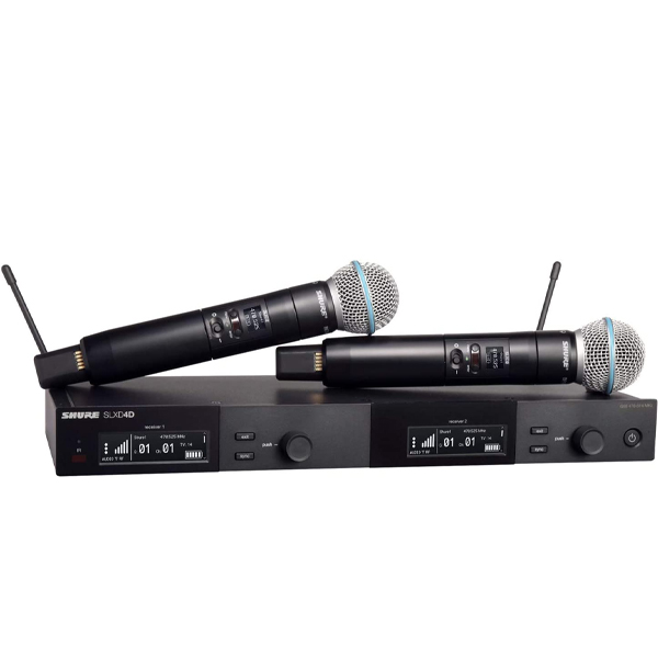 Featuring two Beta® 58 Supercardioid Dynamic Microphone capsules on SLXD2 handheld wireless transmitters, the SLXD24D/B58 provides transparent digital audio and rock-solid RF stability for lecture halls and live performances.