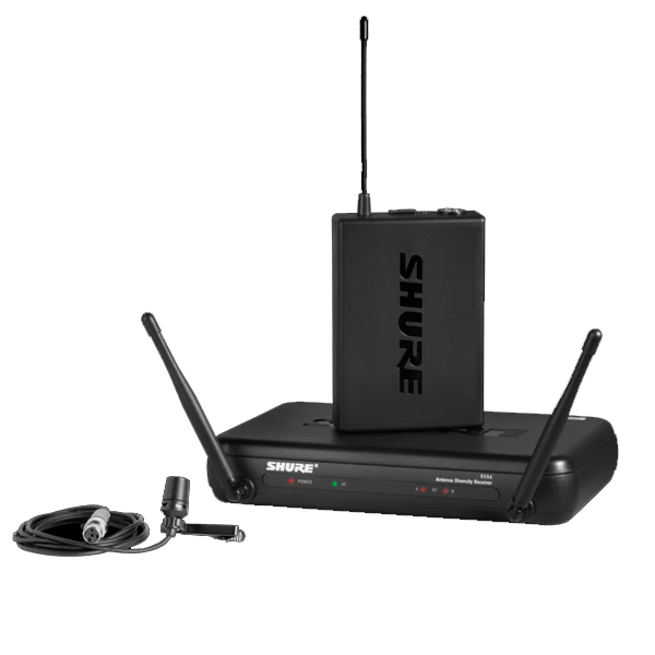 Includes SVX4 Diversity Receiver, and SVX1 Bodypack Transmitter with CVL Centraverse Lavalier Condenser Microphone.