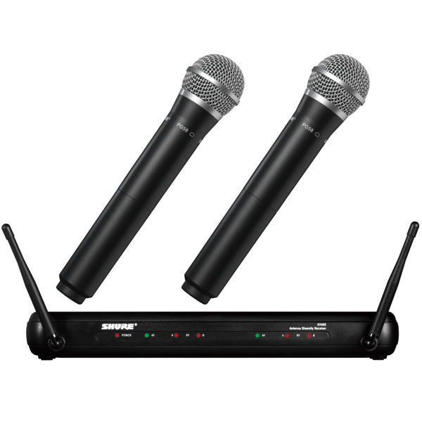 Includes SVX88 Dual Diversity Receiver, and (2) PG58 Handheld Microphone Transmitters.