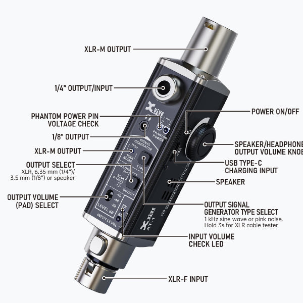 Whether you’re in the studio or counting down the seconds to showtime, the last thing you need is a faulty or damaged connection at the eleventh hour. With the Xvive AT-1, your portable peace of mind has arrived. This flexible, compact tool boasts a pentacle of support capabilities, accommodating 3-pin XLR male and female connectors, 1/4-inch speaker jacks, 1/8-inch headphone cables, and phantom power detection.Moreover, the onboard signal generator is an essential utility for technicians and live performers alike, capable of producing both a 1kHz sine wave and pink noise, which can be routed through the XLR male, 1/4-inch, and 1/8-inch connectors at selectable output levels: -10dB, -20dB, or -40dB.The intuitive interfacing and slim form factor of the AT-1 make it easy and efficient to check and test your gear across PA systems, DI boxes, IEMs, mixers, pedals, and various other audio devices.Plus, the included USB-A to USB-C cable allows for fast charging, and the dual TS male connector lets you quickly verify any 1/4-inch connection. Once everything is in place, the rugged carrying bag provides ample space to pack up and go.