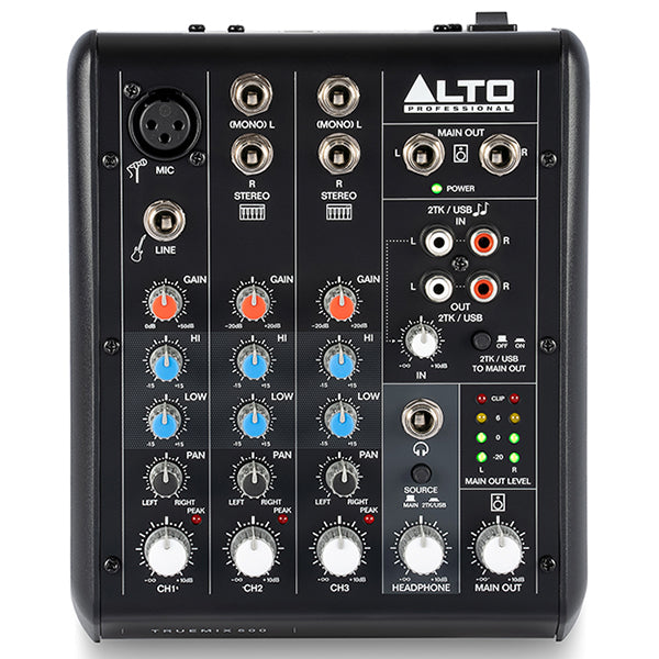 The Alto Professional TrueMix 500 is a portable mixer with a built-in stereo USB audio interface that delivers all the essential features you need for home recording, livestreaming, podcasting, or performing. There are five analog inputs with high-headroom circuitry for minimal noise and clipping in your signal. The Mic Input Channel offers an XLR input that’s great for connecting a dynamic mic. This channel also has a balanced ¼” line input for connecting instruments and other line-level signals. There are also two Stereo Input Channels, each with dual balanced ¼” TRS inputs. These inputs are perfect for your line level audio sources. All channels feature a two-band EQ with color coded knobs that make it easy to dial in your perfect sound when operating in low-light situations. Connecting the TrueMix 500 to your computer is also lightning fast, with plug and play connectivity on Windows and macOS. The TrueMix 500 is your perfect companion for no-nonsense audio mixing and recording on the go.