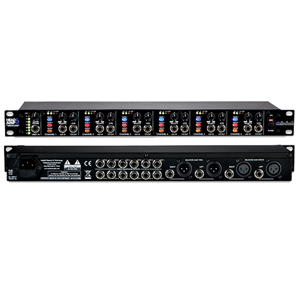 The ART HeadAmp6PRO is a six-channel stereo headphone amplifier that includes a six-channel auxiliary input section that can be used to provide the popular “More-Me” function on each headphone mix. Each output channel also features a dual function BALANCE control which will pan between LEFT & RIGHT sides of the main signal bus, or vary the MIX between the main signal bus and the AUXILIARY input for that respective channel.