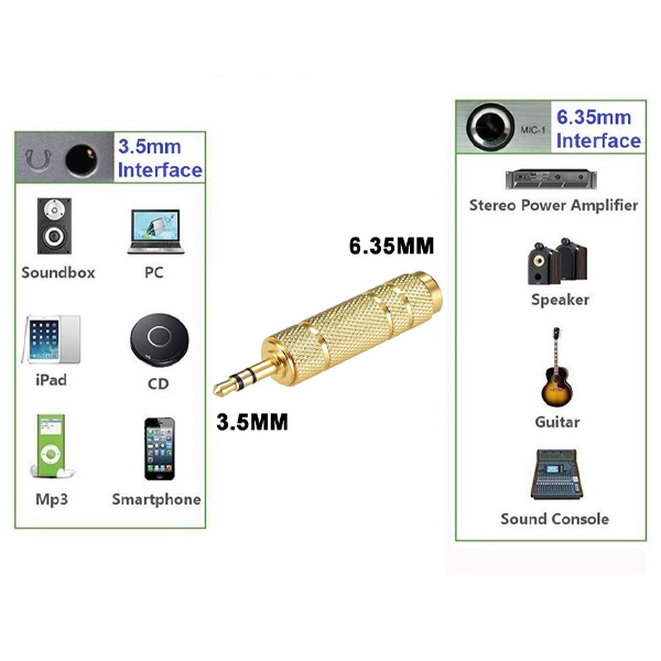 A 3.5mm to 6.5mm audio jack converter (also known as a headphone or audio plug adapter) is a small device used to connect devices with a 3.5mm mini jack (such as smartphones, laptops, or portable audio players) to equipment with a 6.5mm (1/4 inch) audio input, commonly found in professional audio gear like amplifiers, audio interfaces, electric instruments, and mixers. It allows headphones with 3.5mm plugs to be used with 6.5mm audio jacks, or vice versa depending on the adapter type.