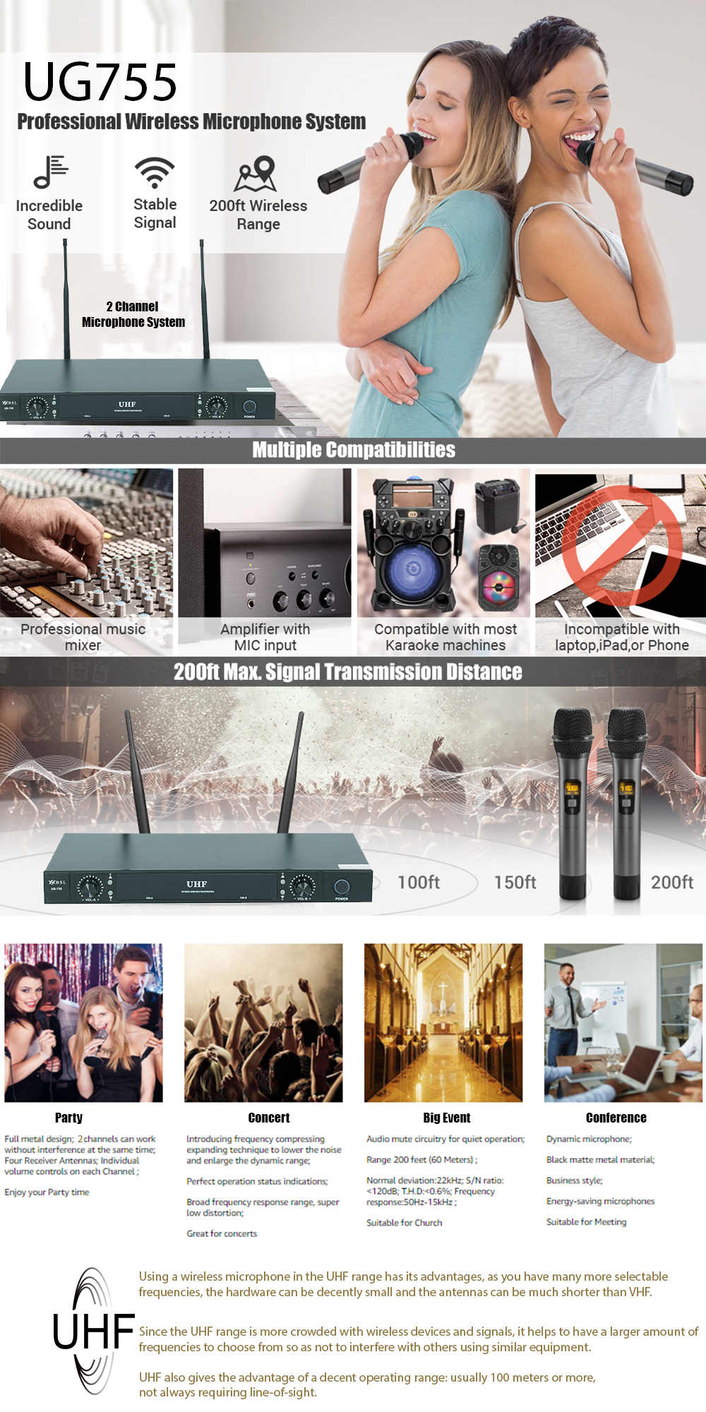 The unit features UHF signal audio transmission for an unsurpassed performance with an operation range of up to 160 ft for clear, noise and distortion free, crisp vocals and excellent sound reproduction