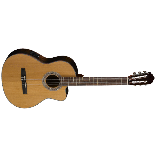 The traditional style AC models have been re-engineered to improve resonance for an authentic classical guitar sound. The nice combination of tone-woods yields a traditional, deep and delightfully mellow tone. Cort AC series is very forgiving of student mistakes,requiring slightly less precision and sharpness for a good tone. AC250CF features Solid Cedar top, Pau Ferro back and sides, Ovangkol fingerboard, Fishman Presys II electronics and Savarez crystal strings.