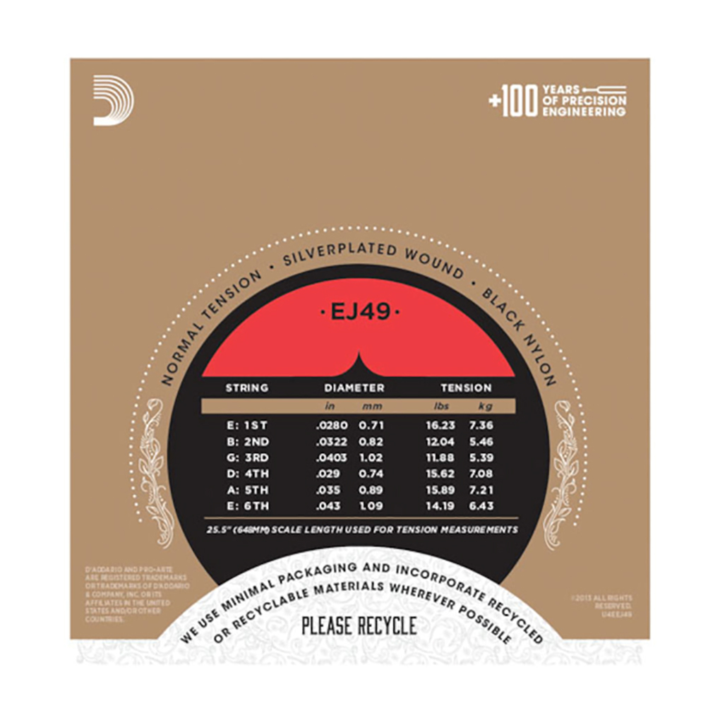 EJ49, normal tension, is D'Addario's best-selling classical set containing custom extruded black nylon trebles, preferred for its balance of rich tone, comfortable feel and dynamic projection. All Pro-Arté treble strings are computer controlled by an X-Y laser microscope which performs diameter and tension measurements, ensuring true-sounding, precise trebles in every set. Pro-Arté basses are wound using silver-plated copper on a multi-filament nylon core for consistent and warm, yet projecting tone.