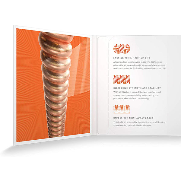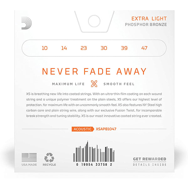 D'Addario XS Acoustic Phosphor Bronze strings combine our most popular acoustic alloy with our most advanced string coating technology, resulting in clear tone, smooth feel, and superior tuning stability – all with the longest possible string life. With its ultra-thin film coating on every wound string and a unique polymer treatment on the plain steels, XS offers our highest level of protection for maximum life. XS also features NY Steel high carbon core and plain string wire, and our exclusive Fusion Twist, for incomparable break strength and tuning stability. XS is the most innovative coated string we’ve ever created. Never Fade Away!