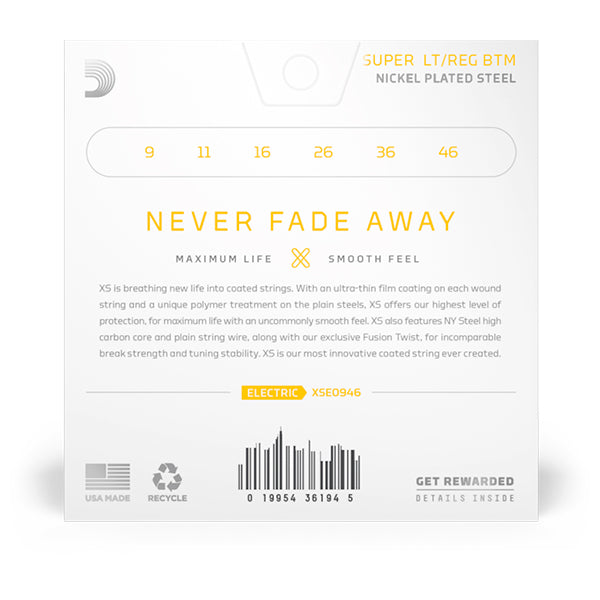 XS Nickel coated electric guitar strings provide the longest life of any D’Addario electric guitar string. Coated with our groundbreaking XS coating, these premium electric strings attain maximum life and a smooth, fast feel without dampening their outstanding tone. Constructed with a NY Steel core, reformulated nickel-plated steel wrap wire, and Fusion Twist technology, XS Nickel strings boast superior strength and tuning stability, plus richer harmonics, greater clarity, and remarkable definition with every sweep, slide, and bend. This 09-46 Super Light Top/Reg Bottom gauge set has more low-end tone than Super Light, while staying flexible for bends.