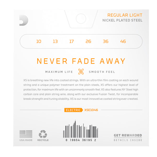 XS Nickel coated electric guitar strings provide the longest life of any D’Addario electric guitar string. Coated with our groundbreaking XS coating, these premium electric strings attain maximum life and a smooth, fast feel without dampening their outstanding tone. Constructed with a NY Steel core, reformulated nickel-plated steel wrap wire, and Fusion Twist technology, XS Nickel strings boast superior strength and tuning stability, plus richer harmonics, greater clarity, and remarkable definition with every sweep, slide, and bend. This 10-46 Regular Light gauge set is our most popular gauge, providing a nice balance of tone and playability.