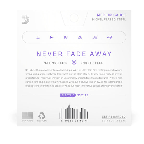 XS Nickel coated electric guitar strings provide the longest life of any D’Addario electric guitar string. Coated with our groundbreaking XS coating, these premium electric strings attain maximum life and a smooth, fast feel without dampening their outstanding tone. Constructed with a NY Steel core, reformulated nickel-plated steel wrap wire, and Fusion Twist technology, XS Nickel strings boast superior strength and tuning stability, plus richer harmonics, greater clarity, and remarkable definition with every sweep, slide, and bend. This 11-49 Medium gauge set provides increased volume, with slightly more tension and resistance.