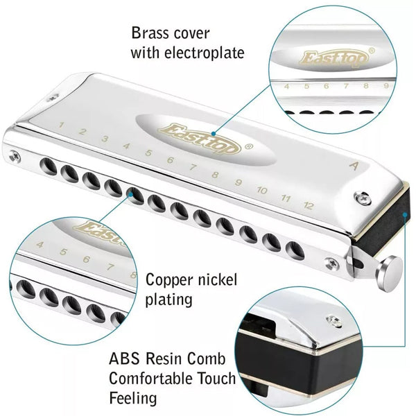 Easttop T1248-C 12 Holes 48 Tones Professional Stainless Steel Chromatic Harmonica - C Key (T1248)
