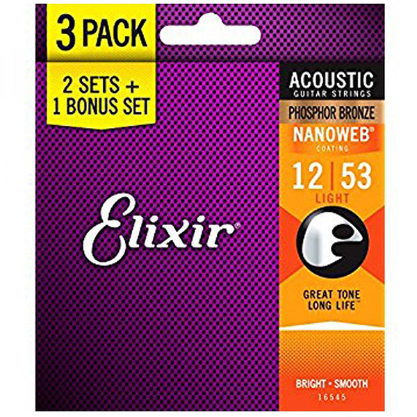 Elixir 16545 Nanoweb Acoustic Guitar String Phosphor Bronze Light Bright Smooth 3 Pack (12-53)