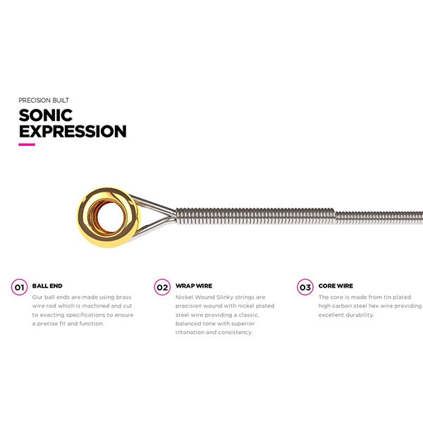 Ernie Ball Nickel Wound Electric Guitar Strings are made from nickel plated steel wire wrapped around tin plated hex shaped steel core wire. The plain strings are made of specially tempered tin plated high carbon steel producing a well balanced tone for your guitar. Gauges .010, .013, .017, .026, .036, .046