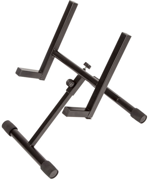 Fixed height elevated amp stand. Especially good for guitar players since the speaker cabinet is not in contact with the floor, which can amplify lowend frequencies. Convenient angle to focus the sound directly to the guitarist. Removable supports for transport. Durable black powder coated finish with cushioned feet.
