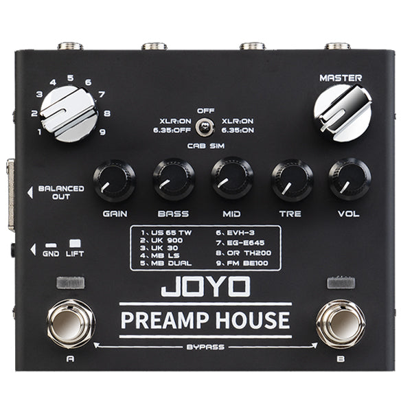 Preamp House is the newly released pedal from JOYO R series, delivering 9 amps’ preamps in one pedal! It has 65Twin / JCM900 / AC30 / LONESTAR / DUAL RECTIFIER / 5150Ⅲ / POWERBALL / TH200 / BE100 and more, each amp features clean channel and distortion channel and can be switched by Footswitches( 18 tones in all)! Due to the 2 channel design, you can switch easily between Fender’s Clean and Marshall’s Distortion! One built-in cabinet simulation facilitates stage performance. FX LOOP interface for external FX pedal, balanced Output. Preamp House is an user-friendly and stable tone solution for musicians who perform and record frequently.