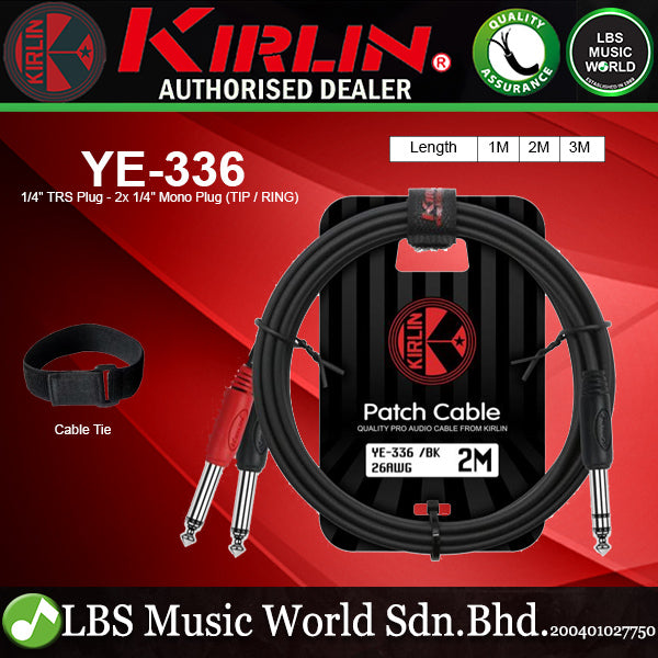 Kirlin YE-336 1/4" TRS to Dual 1/4" Mono Plug Entry Y-Cable Patch Cable - 2 Meter Black (YE336)
