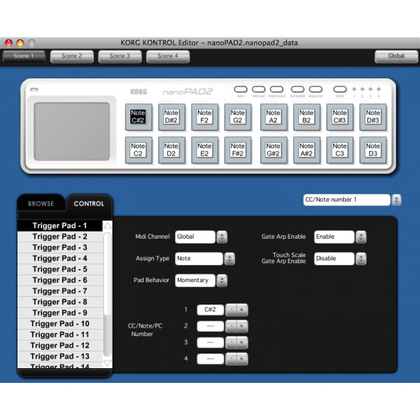 The sixteen velocity-sensitive pads provide excellent response to your fingertips, and also realistically convey the playing feel to your sequencer or DAW software, ensuring that your drum parts will be full of life. By switching between the four scenes, you can experience 64 different pad assignments.