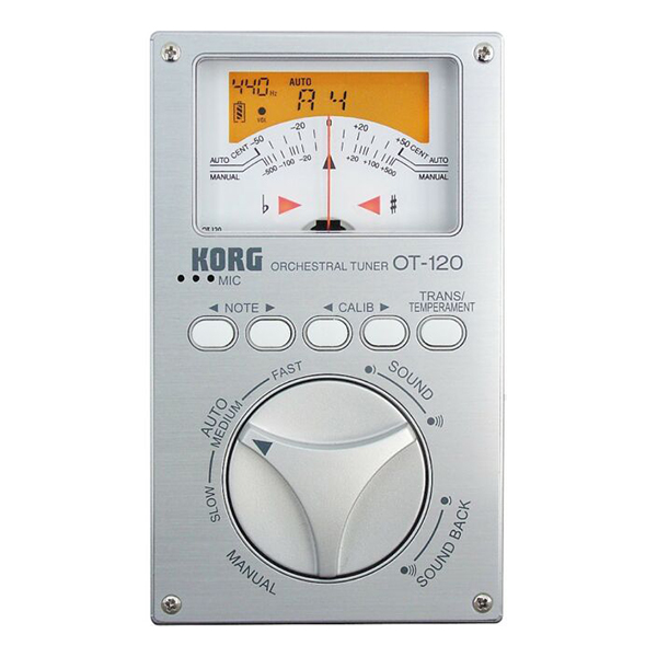 The Korg OT-120 chromatic meter-type tuner specifically addresses the needs of the orchestral musician. The OT-120 also includes those "nice touches" born of actual experience in the orchestra pit with features such as a durable, soft case with belt clip to you put your tuner where it will be easily accessible, instead of sitting in your case or on the floor. TH OT-120 also includes a tilt-back stand. Built-in. The angle is ideally suited for playing while standing so the tune is visible. The Korg OT-120 also incorporates a louder speaker in its space-saving new design that makes it easy to hear and hold, while providing better viewing angles. Another component of the OT-120's new casing is a sleek aluminum panel, offering great looks and more durability for years of reliable travel and use. One last important physical feature before we discuss the functional side of the OT-120, is the placement of the input and output jacks on opposite sides of the OT-120 fir better balance on desktop, amp, instrument case, music stand etc.