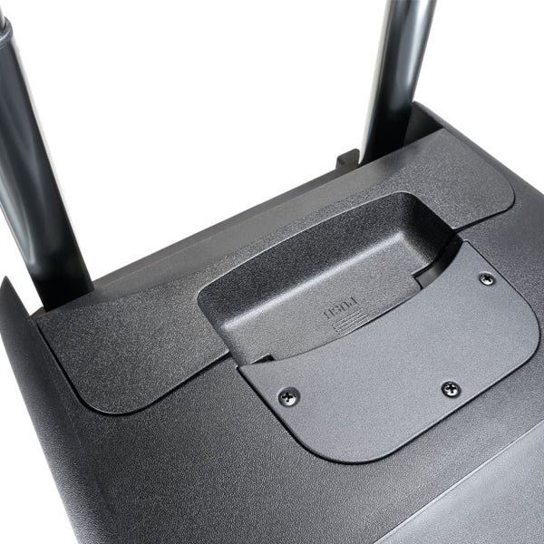 The LD Systems Roadbuddy is easily transportable thanks to built-in castor wheels and a pull-out handle. On the top, there is a handy storage compartment for up to two hand-held transmitter microphones. The plastic housing of this lightweight device has been designed to accommodate a 35 mm tripod mount.