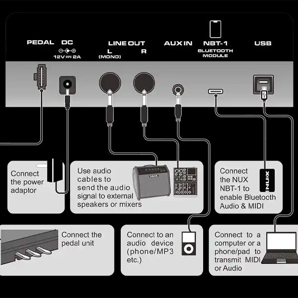 - Keyboard: NUX WKJ-03 Triple-Sensor Scaled Hammer-Action Weighted Keyboard with escapement and synthetic ivory/ebony keytops.