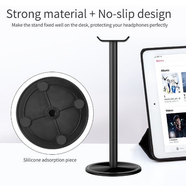 Strong material and non slip design.Makes the stand fixed well on the desk, protecting your headphones perfectly. It also has silicone adsorption piece. It also has flexible headrest, aluminium supporting bar and no-slip solid base.