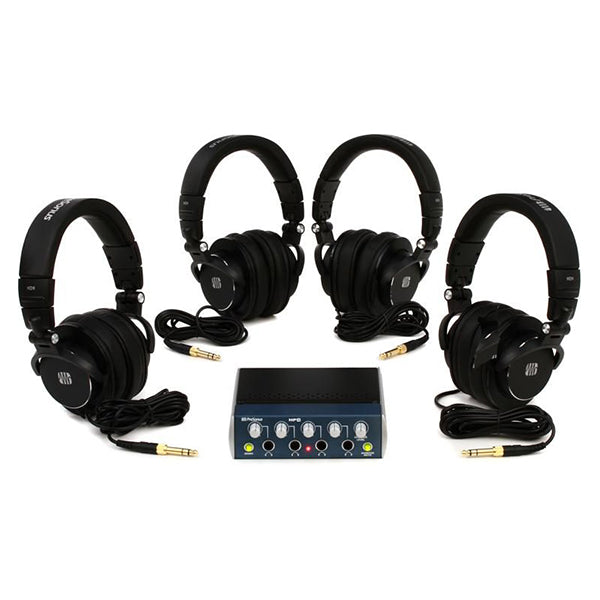 Up to four bandmates and coproducers can collaborate without disturbing family and neighbors using this all-PreSonus monitoring package. You get four comfortable, durable PreSonus HD9 professional studio headphones, which feature 45 mm dynamic, neodymium drivers in a closed-back acoustic design for superior listening isolation, high power handling, and a tailored frequency response from 10 Hz to 26 kHz. Feed your HD9 headphones using the included PreSonus HP4 headphone amplifier’s four screaming loud, crystal clear headphone preamps with individual level controls and mono summing. Send the stereo signal to studio monitors or daisy-chain another headphone amp using the ¼-inch balanced line outs.