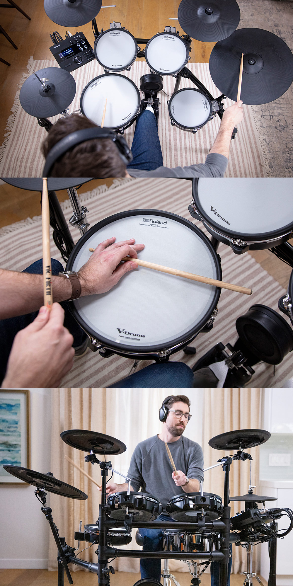 Roland’s Prismatic Sound Modeling brings you an electronic drumming experience like no other. We start with carefully curated samples of real drums and percussion, recorded by top players in leading studios. Next, we bring these static samples to life with advanced modeling that recreates the acoustic behavior between each sample for a smooth, true-to-life drumming experience.