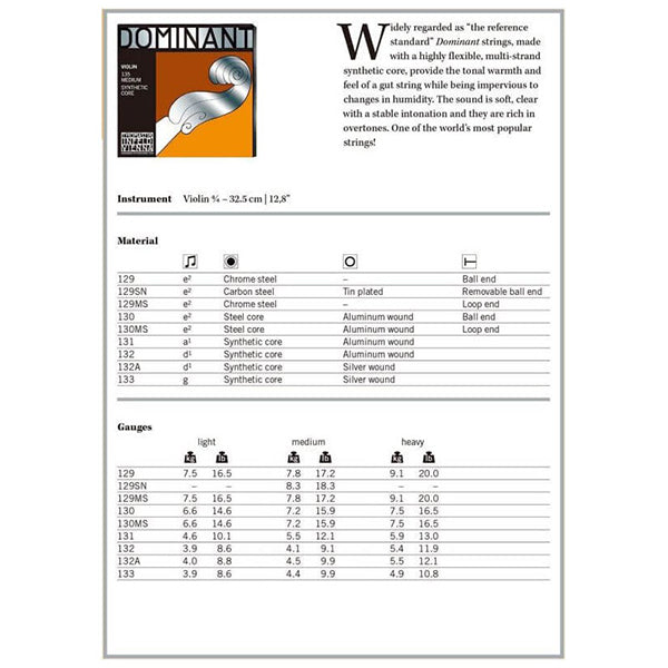 Comparable in sound to gut, without gut's disadvantages These strings have a highly flexible, multi-strand nylon core and cater for artists who feel uncomfortable with steel strings. The resounding success of our Dominant string owes a lot to its similarity in tone and response to gut strings, without gut's attendant drawbacks. The sound of the Dominant string is full and mellow, yet rich in overtones. Its radiance, its ability to project sound without being metallic, comes to the fore both in arco and pizzicato. Other advantages are Dominant's effortless response to intricate fingering and its tuning stability even under extreme atmospheric conditions. But Dominant's beauty of tone is not as long lasting as that of a steel string, a price the discerning musician will be prepared to pay for this quality of sound. Dominant strings should be changed at appropriate intervals to ensure continuity of tone color.