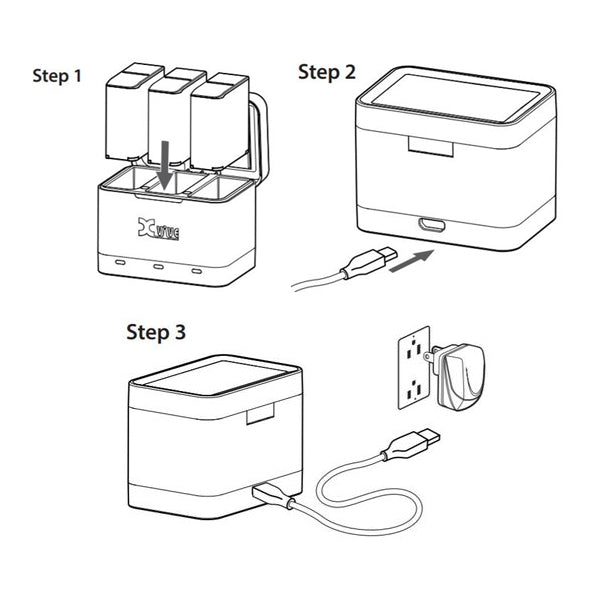 - Connect to any 5V USB power source and charge all three batteries in 2 hours